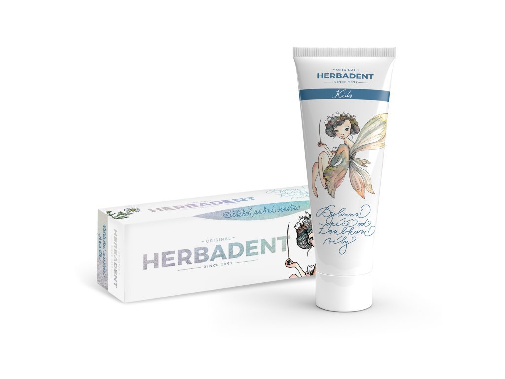 HERBADENT KIDS bylinná zubní pasta s obsahem fluoridů 450 ppm je speciálně určena pro čištění mléčných zubů a dětských dásní. Neobsahuje žádná chemická pěnidla, je bezlepková a zcela bez cukru, přesto si ji děti oblíbí. Nejen pro její příjemně nasládlou chuť a vůni, ale také pro vyobrazený motiv hodné Zoubkové víly, která dětem pomáhá s péčí o zoubky. Určena pro první dětské zoubky.