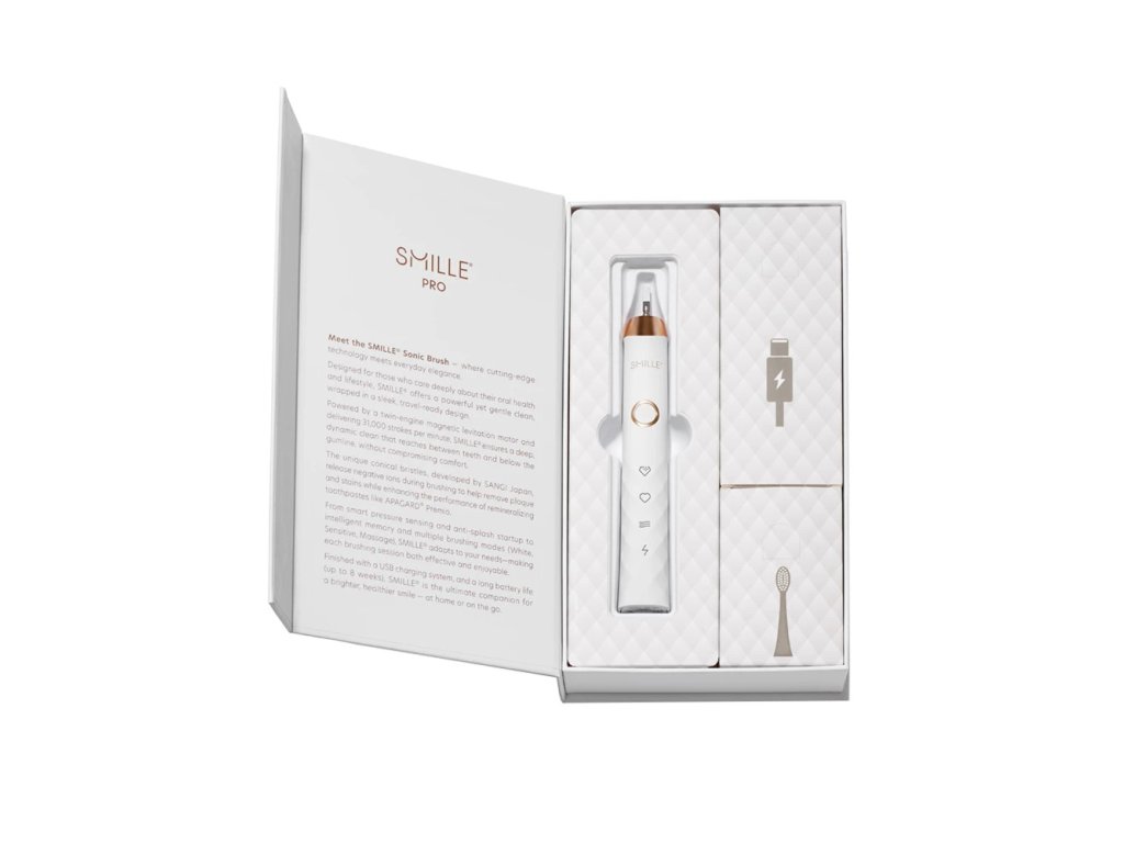 SMILLE Sonic Brush přináší profesionální úroveň čištění v designu, který se snadno stane součástí vašeho každodenního rituálu. Díky dvojitému motoru s magnetickou levitací a až 31 000 čisticím tahům za minutu odstraní plak i z míst, kam se běžný kartáček nedostane – a přitom zůstává výjimečně jemný.